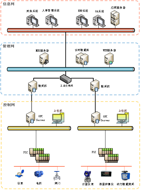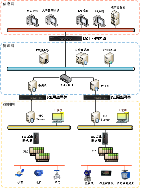 企業管理者通過從信息網ERP系統中提取有關生產數據用于制定綜合管理決策;從管理網MES系統中層獲取數據,完成各種控制、運行參數的監測、報警和趨勢分析等功能。控制網負責通過組態設汁,完成數據采集、A/D 轉換、數字濾波、溫度壓力補償、PID 控制等各種功能。系統的每一個安全漏洞都會導致嚴重后果,所以將它們單獨隔離防護十分必要。